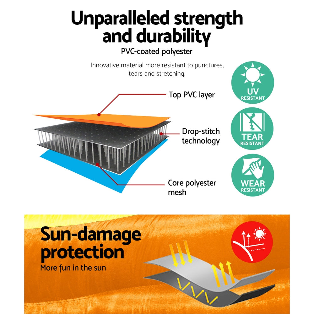 Experience the thrills of a water park from the comfort of your own backyard with the Bestway Inflatable Water Park. The park combines a climbing wall, curved slide, splash pool, water gun and a randomly tipping bucket to keep your kids thoroughly entertained for hours on end. Made of durable and colourful double-stitched PVC-coated polyester, the water park is resistant to punctures and tears. The entire park inflates in under 2 minutes using the supplied blower. The tipping bucket keeps the slide wet for slippery fun, while the water gun can be operated from underneath a shaded canopy with included cup holder. The included bouncer stakes keep the inflatable in place, while a quick drain release valve makes packing down easy. Includes a repair patch for accidental punctures so you can keep the fun going without hassle. Get ready for summer and let your children have a splashing good time outdoors with the Bestway Inflatable Water Park.