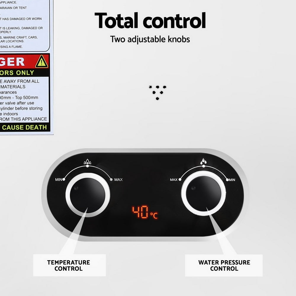 Experience the luxury of a warm shower in the great outdoors with the Devanti Gas Water Heater. This versatile and efficient outdoor showering solution offers convenience, clearly displayed on its LED screen. Safety is paramount, with a built-in processor limiting the maximum water temperature to 60°C, to help preventing any accidents. The showerhead features an automatic on/off trigger for easy operation, while a variety of additional safety features ensure worry-free use. Designed for portability and ease of use, the Devanti Gas Water Heater comes equipped with a handy carry handle and all necessary mounting brackets for quick and hassle-free setup. Its lightweight construction makes it ideal for camping trips, beach outings, or any outdoor adventure where a warm shower is desired. With both winter and summer settings and adjustable water flow this LPG-powered heater offers a perfect blend of comfort and practicality for outdoor enthusiasts. Enjoy the freedom of the open country without sacrificing the comfort of a warm shower – the Devanti Gas Water Heater is your perfect outdoor companion.