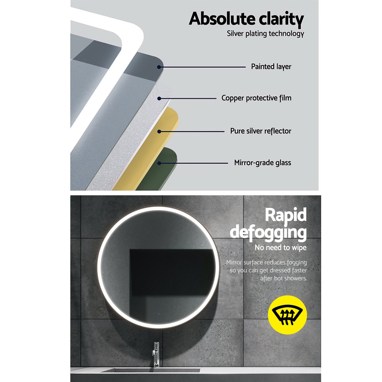 Fairest beauty looks even better with our Embellir LED Mirror. With it large 80cm diameter, the mirror is strong and made to last. It also features an energy-efficient LED light strip that goes around the circumference of the mirror to add vivid illumination to its reflections. The waterproof LED strip has a longlasting working lifespan of up to 50,000 hours. The light can be easily turned on and off with just a touch switch. Or long press to change the brightness. Better still, the rapid defogging mirror surface means that you can keep the mirror in the bathroom without needing to wipe it up after every hot shower. Not least, the mirror also includes wall mounting accessories for an easy install.
