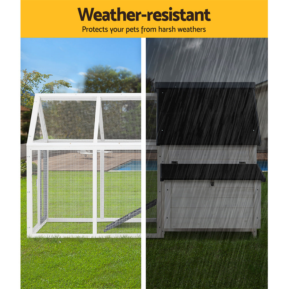 Give your beloved pets a safe and comfortable home to sleep, rest, play, and relax. The i.Pet's pet hutch makes a cosy home for your dear pets they will love and cherish forever. This pet hutch is suitable for smaller pets such as rabbits, chickens, hens, guinea pigs, hamsters, chinchillas and ferrets. Our pet hutch features a solid fir wood construction with galvanised mesh that ensures its sturdiness and durability for many years. It has a stable and firm base that's crucial for stability. Our pet hutch has black asphalt felt roof that provides good protection from sun and rain, keeping them cool in summer and warm in winter. It has a spacious integrated ground enclosed play area that allows your pets to have a great playtime outdoors. And the built-in foldable ramp that connects the ground area and hutch enables convenient entry and exit. Furthermore, the pet hutch also comes with a hatching box for egg collection and a slide-out tray for easy cleaning, and the front entrance door with sturdy security locks makes it even more convenient and reliable. The enclosed play area has a mesh structure, which keeps your pets comfortable and well-ventilated. This pet hutch will give your beloved pets the utmost joy and pleasure. Gift this pet hutch to your pets today, and be sure to get much love in return.