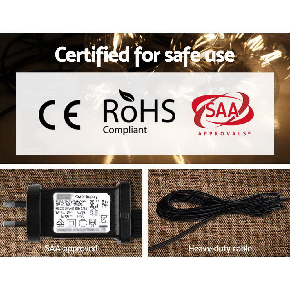 Our Jingle Jollys Festoon String Lights are great not only for wedding and birthday parties or special events, but also for creating a warm, inviting ambience with its bright and mellow glow. Suitable for both indoor and outdoor use, its IP44 rating means that it can be used in the rain and all weather conditions. Each bulb draws a very low voltage and is placed 90cm equally apart from each other throughout its 59m length for an even distribution of illumination and brightness. Not least, the each bulb has a 20,000 hours lifespan so that you can get to use the string lights for quite a while.